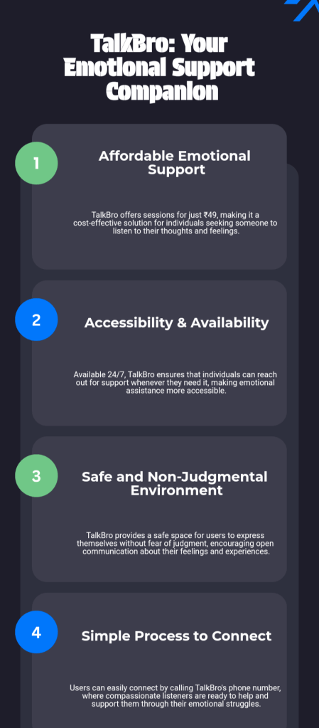 Feeling alone, stressed, happy, or just need someone to talk to? TalkBro is here to listen and connect with you anytime. For just ₹49, share your thoughts, express your feelings, and experience the relief of being heard.
